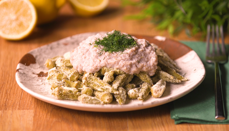 Fırını önceden 180 derecede ısıtın. Tukaş çiçek bamyayı süzün. Üzerine mısır unu, tuz ve karabiber döküp karıştırın. 20-22 dakika fırında pişirin. Ceviz, sarımsak, tuz, karabiber ve ekmek kırıntısını blenderda çekin. Karışımı bir kaba alın ve içerisine su ve limon suyunu ilave edip karıştırın. Fırından çıkan bamyaları tabağa alın ve üzerine sosu dökün. Dereotu ile süsleyip servis edin.